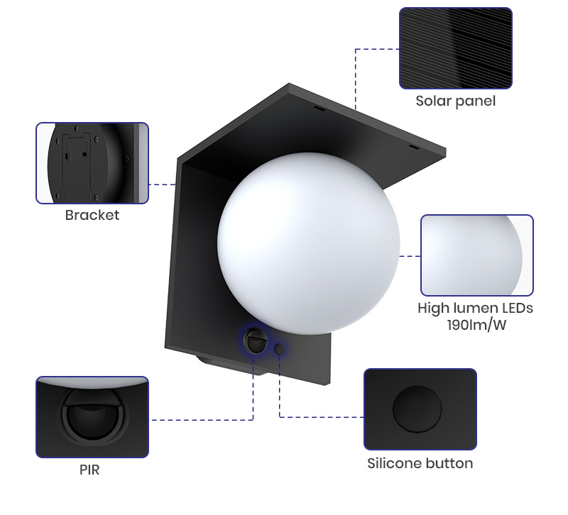 Lámpara solar esferica para pared META 26 de 1000 lúmenes con sensor de movimiento